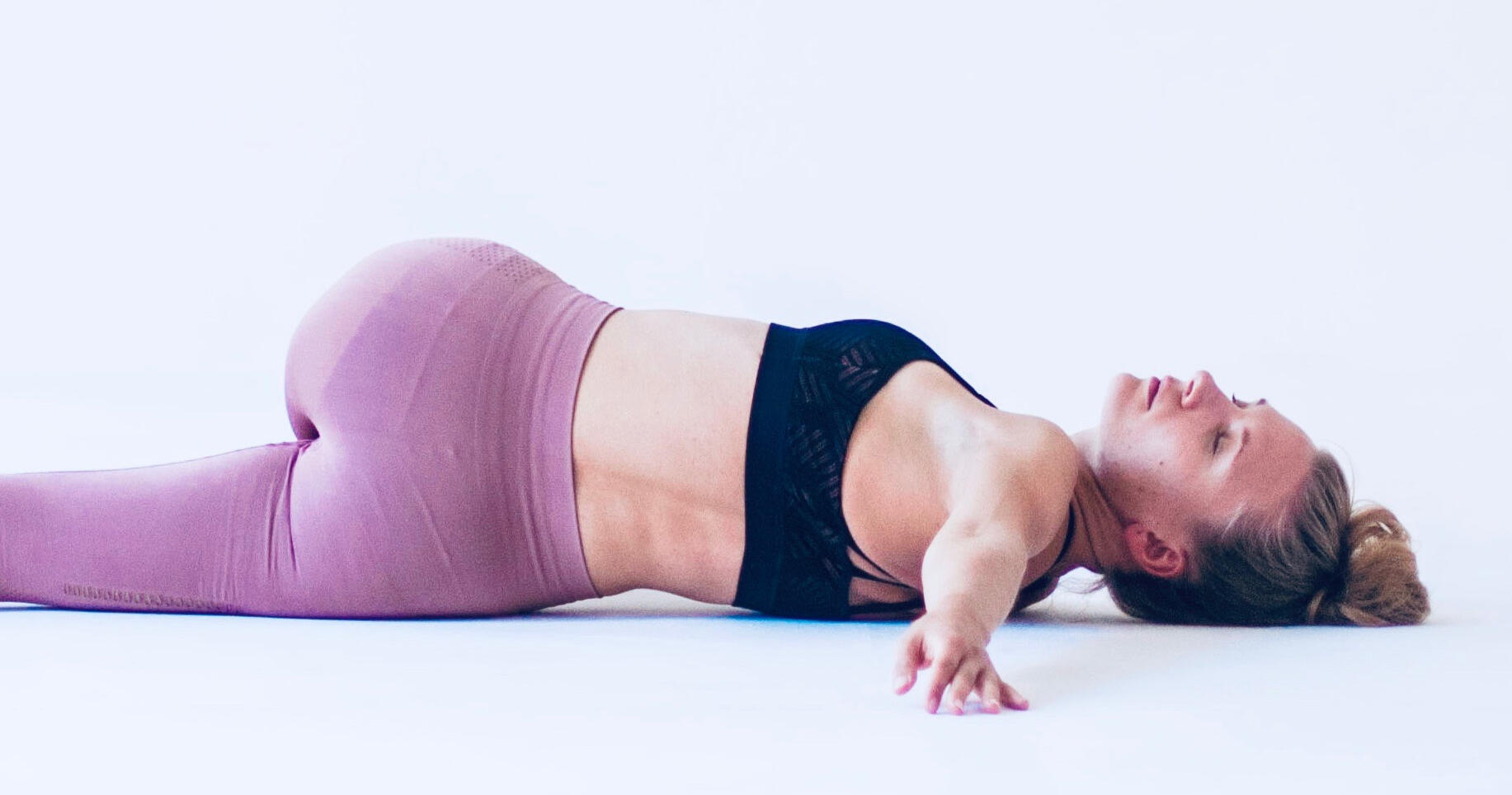 Supta pidita asana - držíme vnější stranu chodidel, kolena k zemi, holeně kolmo